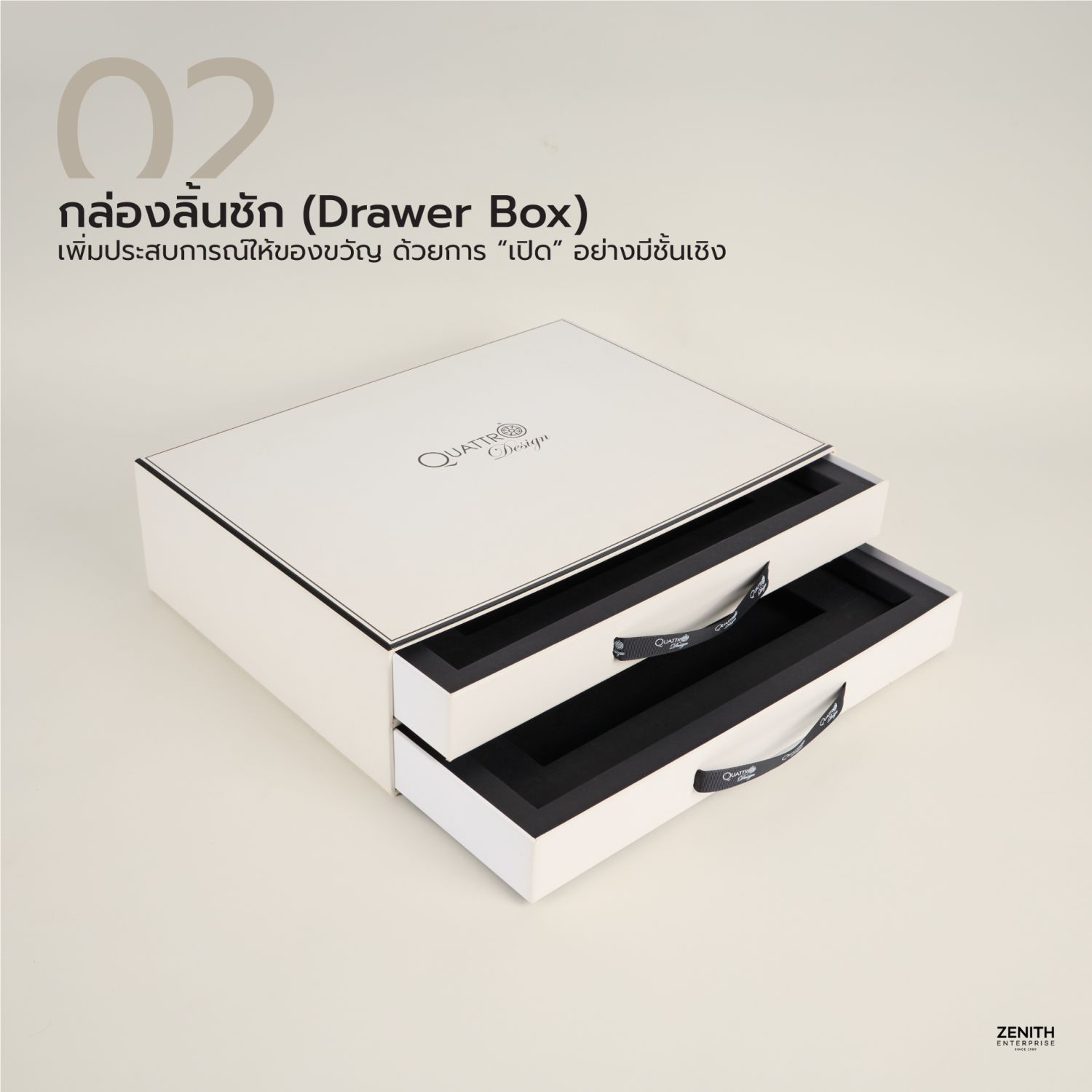 ดีไซน์ลิ้นชักที่เลื่อนเปิดได้เหมือนกล่องสมบัติ ช่วยเพิ่มความว้าวให้กับสินค้า เหมาะกับของขวัญที่ต้องการความละเอียดและความรู้สึกพรีเมียมสูง