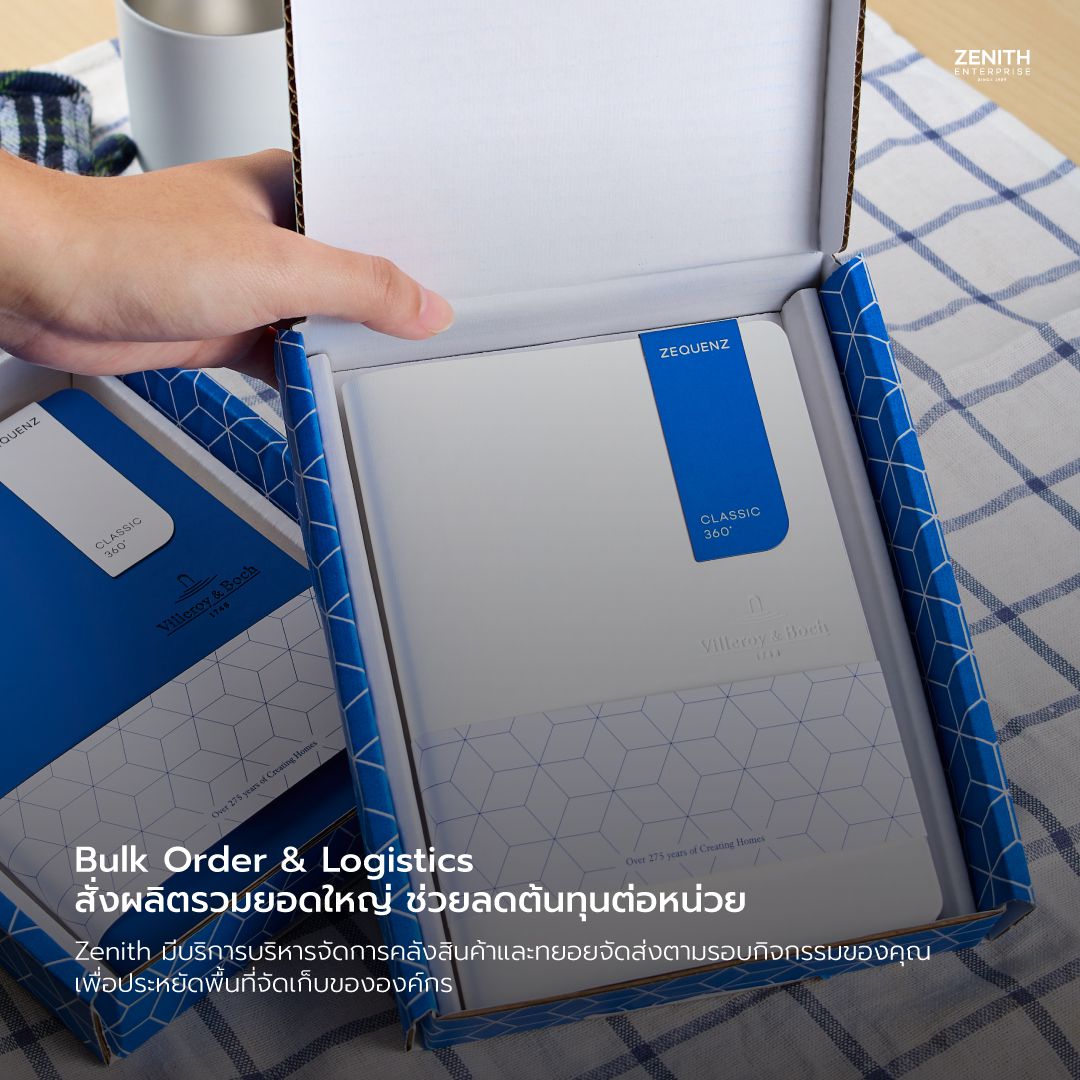 การทำ Bulk Order หรือการรวมยอดสั่งผลิตใหญ่ในครั้งเดียว เป็นวิธีที่ช่วยลด ต้นทุนต่อหน่วย (Unit Cost) ได้อย่างมีประสิทธิภาพที่สุด ทั้งนี้ Zenith เรามีระบบบริหารจัดการคลังสินค้า (Warehouse Management) และบริการทยอยจัดส่งตามรอบกิจกรรม (Split Delivery) จึงสามารถช่วยประหยัดพื้นที่จัดเก็บและอำนวยความสะดวกให้องค์กรของคุณได้