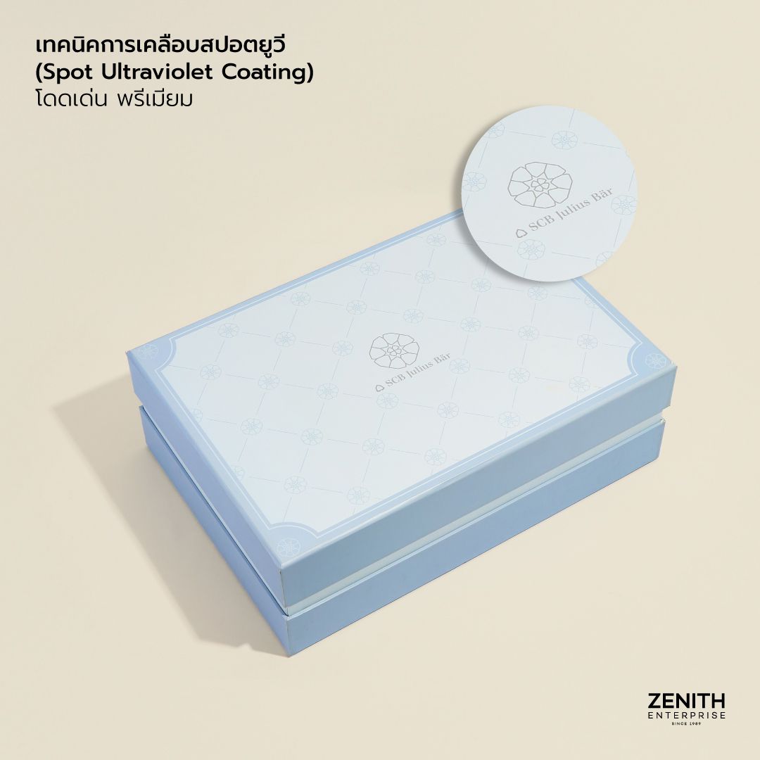 - เทคนิคการเคลือบสปอตยูวี (Spot Ultraviolet Coating) เป็นการเคลือบสารยูวีเฉพาะจุดบนพื้นผิววัสดุ เพื่อเน้นให้บริเวณที่เคลือบมีความเงางาม แตกต่างจากพื้นผิวบริเวณอื่น